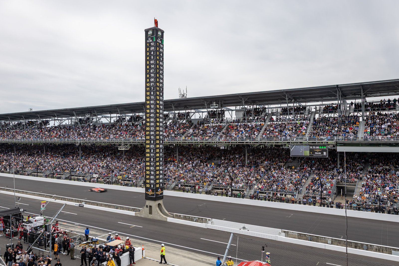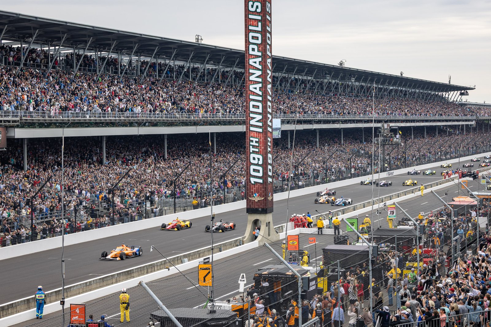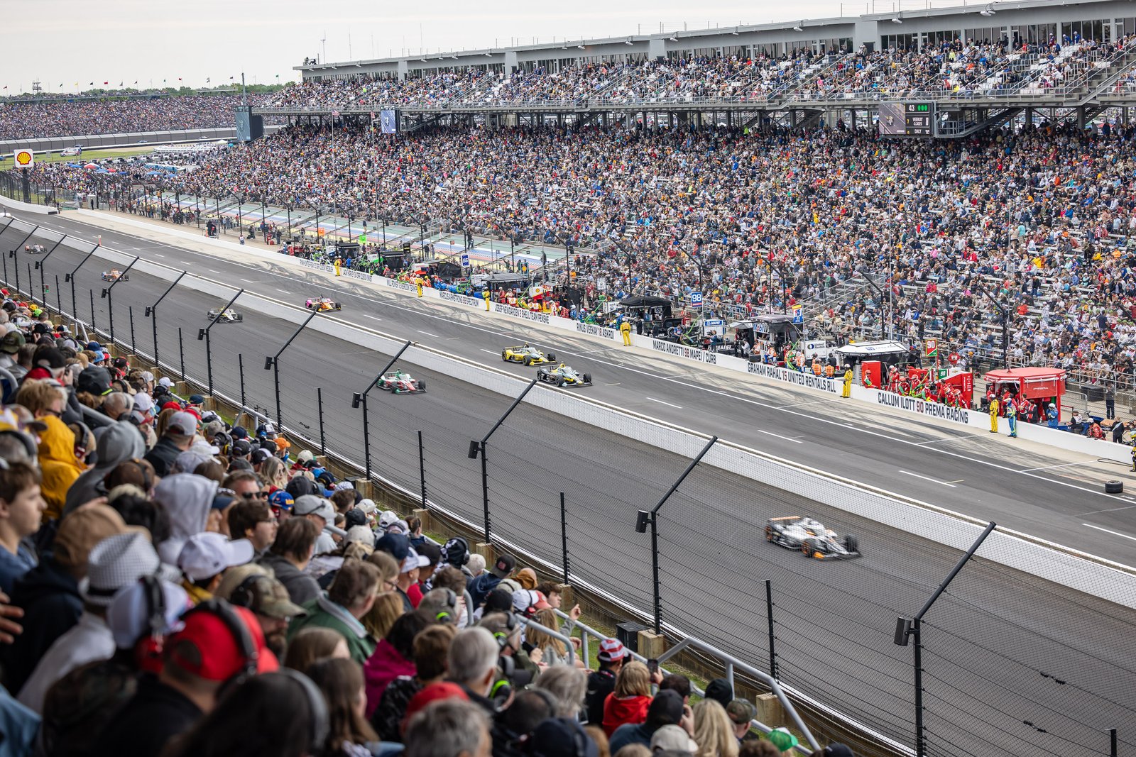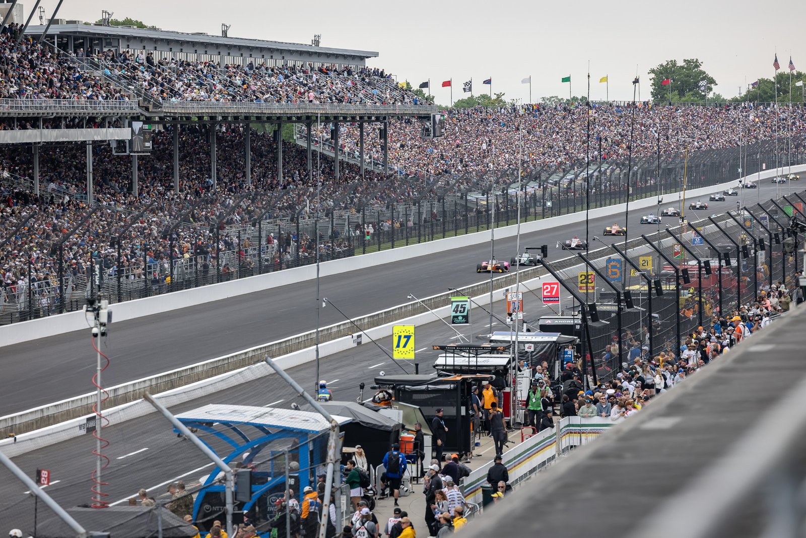 Leaders are Among a Large Group of Cars on the Main Straight Late in the 2025 Indy 500
